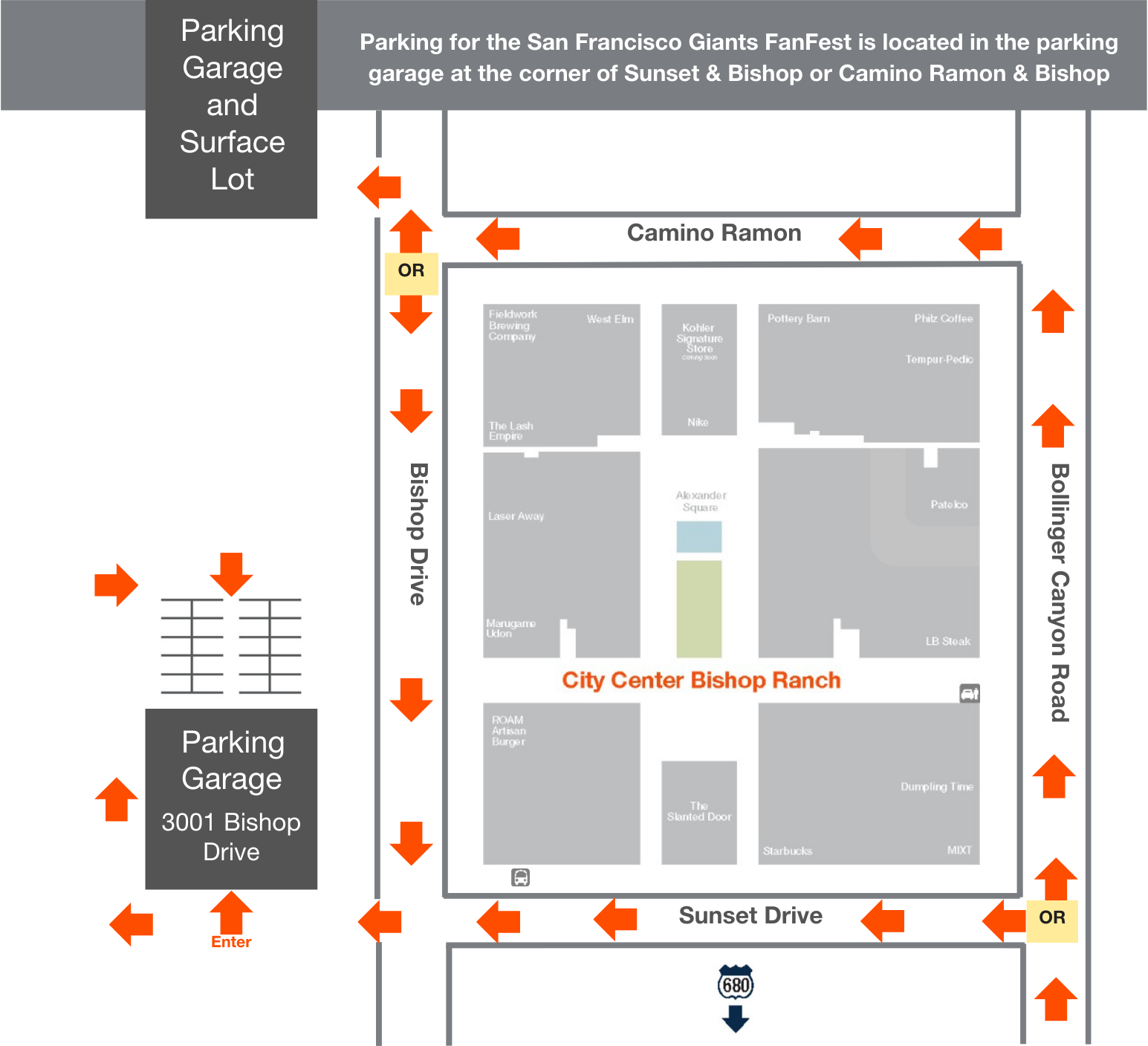 There is plenty of free parking at 3001 Bishop Drive and at the corner of Camino Ramon and Bishop Drive as shown on the map below. Admission is free, but tickets are required and available now.